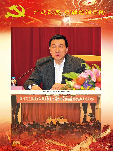 為深入學(xué)習(xí)貫徹黨的十七屆六中全會(huì)精神,研討進(jìn)一步落實(shí)“十二五”時(shí)期中央企業(yè)改革發(fā)展總體思路和國資監(jiān)管、國企發(fā)展“兩新目標(biāo)”,以及機(jī)關(guān)建設(shè)規(guī)劃綱要的思路和措施,同時(shí)梳理2011年的工作,研究2012年的工作,按照委國資委黨委的部署,11月15日至12月9日,國資委先后舉辦了4期學(xué)習(xí)貫徹六中全會(huì)精神理論培訓(xùn)班。國資委主任、黨委書記王勇親自為參加培訓(xùn)班的全體同志作動(dòng)員報(bào)告,并在第一期班暨黨委中心組學(xué)習(xí)會(huì)上作了總結(jié)講話。在京的國資委黨委委員、副秘書長,機(jī)關(guān)廳局長、監(jiān)事會(huì)各辦事處主任和全體黨員干部以及直屬事業(yè)單位、管理局系統(tǒng)黨政領(lǐng)導(dǎo)班子成員、直管協(xié)會(huì)和部分京外企業(yè)在京單位黨組織負(fù)責(zé)同志共計(jì)1100余人參加了培訓(xùn),監(jiān)事會(huì)主席單獨(dú)進(jìn)行了培訓(xùn)。